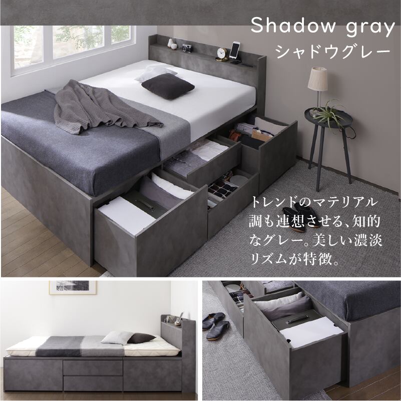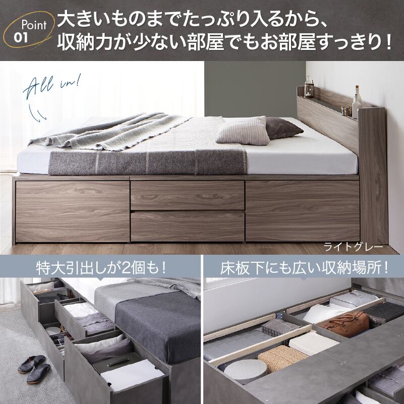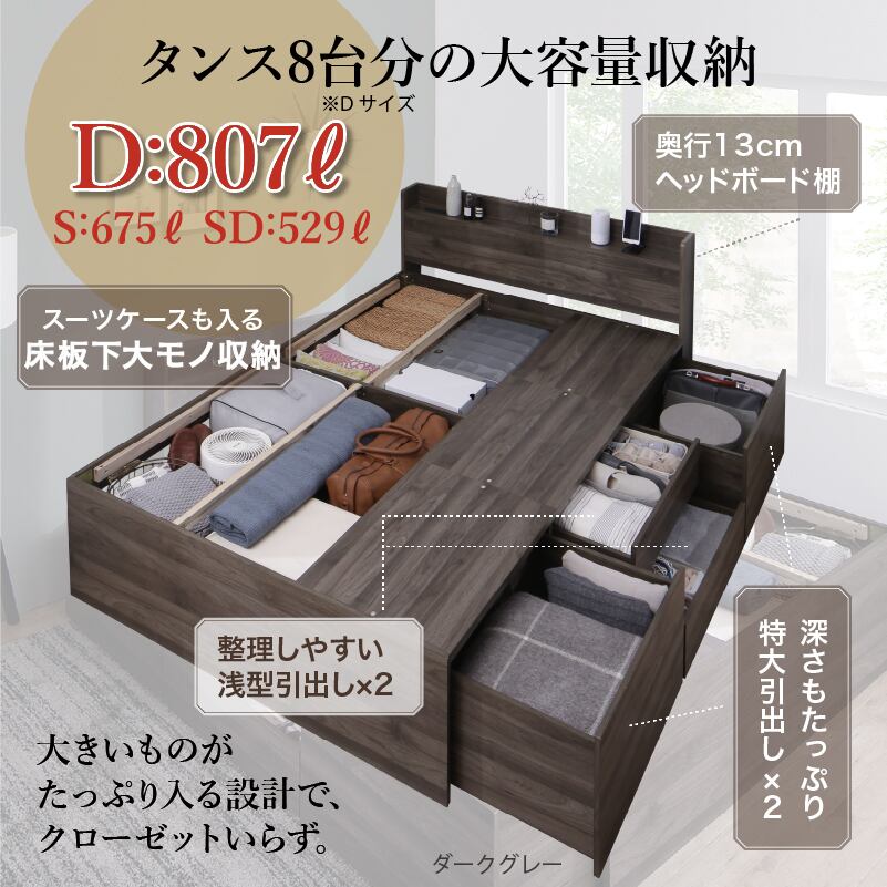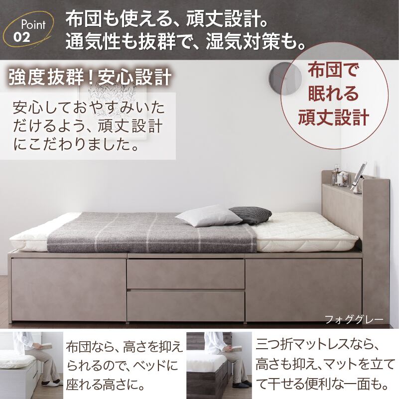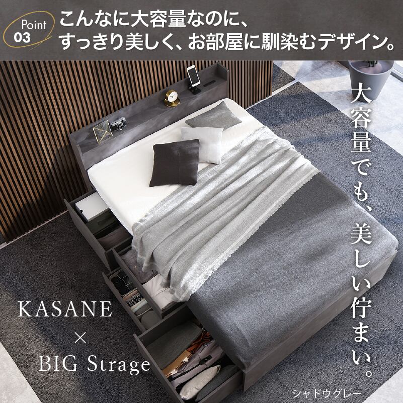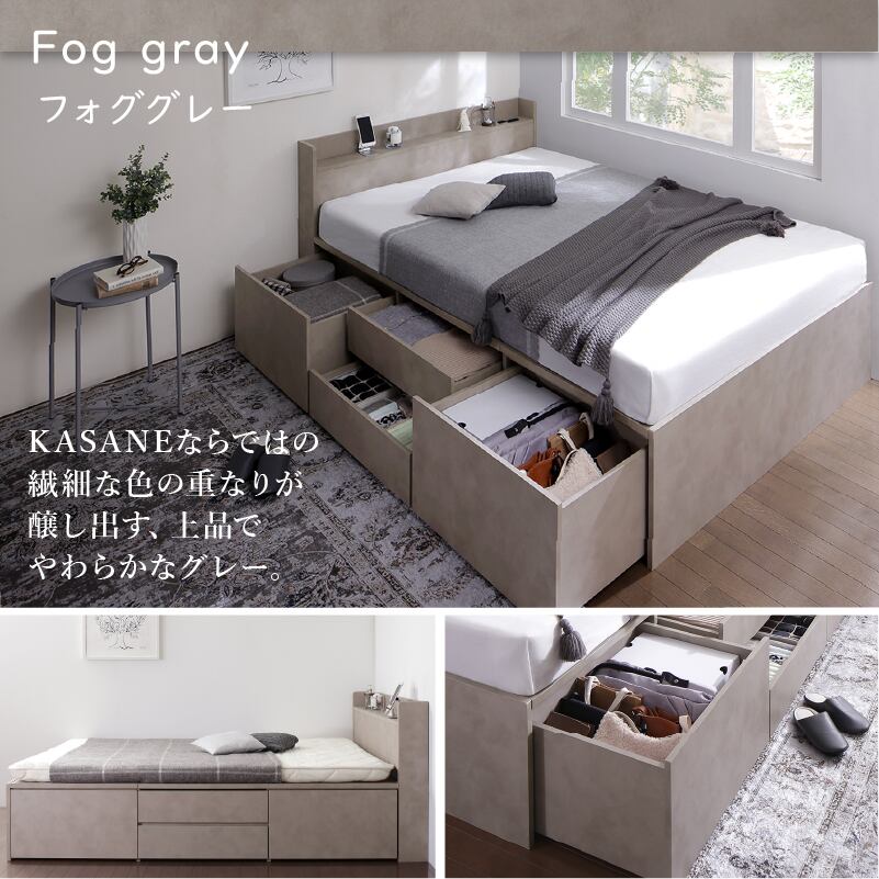 たっぷりしまえて、美しく整う タンス級の収納力×上質デザイン KASANE 5colors×3size これ一台でベッドも収納家具も 圧倒的収納力 コンセント2口 頑丈・敷布団OK S/SD/D
