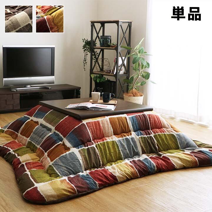パッチワーク風のデザインをしたこたつ布団です。国内でわた入れをしています。側地にはポリエステル素材を起毛させた柔らかい生地を使用しています。部分暖房のこたつは電気代もおトクです。