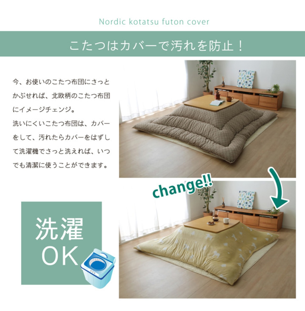 シンプルなデザインのこたつ布団カバーです。生地には伸縮性がありやわらかなタッチ感の素材を使用しました。ファスナー付きなので着脱も簡単です。洗濯機で洗えるので清潔にご使用できます。