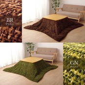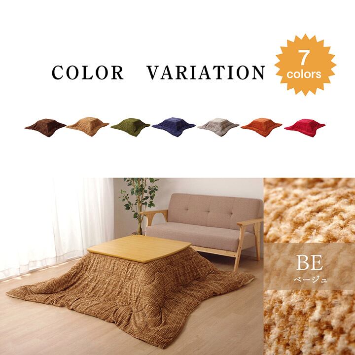 あたたかみのあるカラーを使用したこたつ布団です。表地は凹凸感を持たせポコポコとしたタッチ感が特徴です。裏地にはなめらかな肌触りのフランネルを使用しています。薄手なので折りたたんでもかさばらず、コンパクトに収納できます。布団の内側に紐をつけることにより、布団と台がずれないようにしました。部分暖房のコタツは電気代もおトクです。