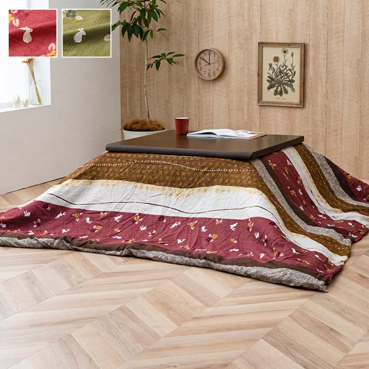 明るいうさぎ柄のファスナー付きコタツ掛けカバーです。洗濯機で洗えるので清潔にご使用できます。