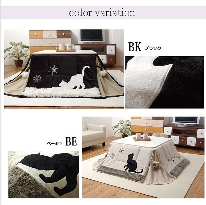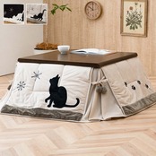 人気のネコ柄のコタツ布団です。ネコの柄をシルエット調にし、雪の結晶はプリントではなく、刺繍で表現することで、甘くなりすぎず、シックな雰囲気に仕上げました。表地には耐久性に優れ、しっとりとやわらかな短毛のマイクロファイバー生地を使用しています。裏地には軽くて保温性の高いフリースを使用しています。省スペースタイプで角が膨らまず、お部屋を広く使えます。薄手なので折りたたんでもかさばらず、コンパクトに収納できます。部分暖房のコタツは電気代もおトクです。