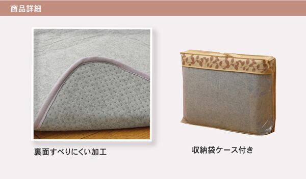 両面不織布のラグマットです。お手持ちのホットカーペットカバーの下に敷くだけで、ボリュームアップできる商品です。フローリングの上でのご使用にピッタリです。中材の厚みが8mmで適度なクッション性があります。厚みがあるので冬には底冷えがしにくく、また裏にはすべりにくい加工を施しております。小さなお子様がいらっしゃるので頻繁に洗濯される方、薄手のキルトラグをご使用の方、ボリュームタイプがいいけど、洗いたいという方にお勧めの商品です。※本商品は30℃以下の水温での弱い手洗いをお勧めします。