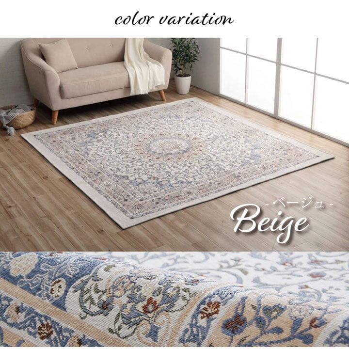 手織りのような上品な風合いのジャガード織で、北欧風の幾何柄を表現。デザイン性が高く、耐久性にも優れています。さらっとした肌触りで、季節を問わず一年中お使いいただけます。 遊び毛が出にくいシェニール糸を使用しています。毛足が短いためお掃除も簡単です。裏面にはフローリングを傷つけにくい不織布張り。滑り止め加工も施しています。 ホットカーペット、床暖房対応。