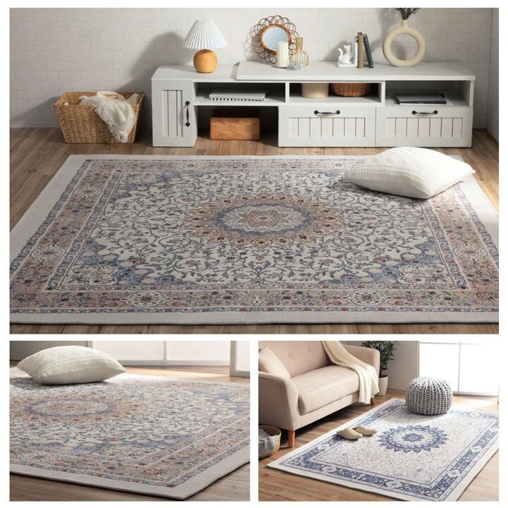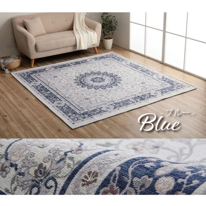 手織りのような上品な風合いのジャガード織で、北欧風の幾何柄を表現。デザイン性が高く、耐久性にも優れています。さらっとした肌触りで、季節を問わず一年中お使いいただけます。 遊び毛が出にくいシェニール糸を使用しています。毛足が短いためお掃除も簡単です。裏面にはフローリングを傷つけにくい不織布張り。滑り止め加工も施しています。 ホットカーペット、床暖房対応。