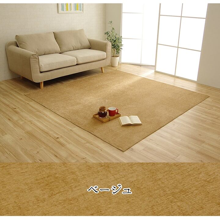 無地のラグです。選べる7色展開でお部屋に合ったお色を選べます。遊び毛が出にいシェニール糸を使用しています。毛足が短いためお掃除も簡単です。裏面にはフローリングの上でもご使用できるよう、滑りにくい加工を施しております。洗濯機で丸洗いでき、お手入れが簡単です。ホットカーペットカバーとしてもご使用できます。