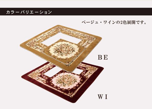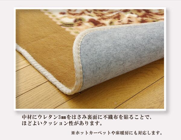 掘りごたつ対応のカーペットです。表地の表面は柄が立体的に見えるカービング加工(柄部分周辺を手作業でカットし、彫刻のように凹凸を付けた加工)を施し高級感を持たせました。中材にはウレタン3mmを使用しておりますので、ほのかなクッション性があります。フローリングを傷つけにくいよう裏には不織布を貼っています。電気カーペットカバーとしても使用できます。※くり抜き部分もお届けします。※職人が手作業にて加工を行うため、サイズには多少の誤差が生じます。ご了承下さい。