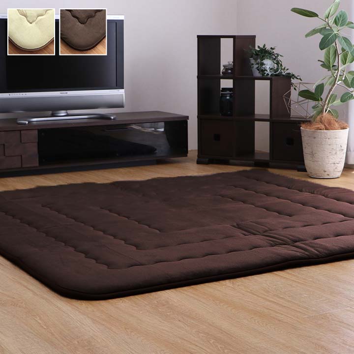 表地には肌触りが良く、耐久性に優れたマイクロファイバーを使用しています。中材にはクッション性にこだわった国産の固綿40mmを使用しています。十分な弾力性があるのでフローリングでのご使用にも最適です。遮音特級LL-30を取得しています。床下への騒音も軽減します。また、こたつと併用するとこたつの熱を床下へ逃しにくくなるので省エネ効果もあります。