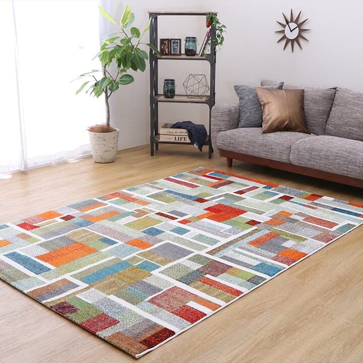 トルコ製のウィルトン織りカーペットです。本商品の『繊維の密度を表すノット数』は112,000ノットです。カラフルな幾何柄を落ち着きのある色合いでまとめました。本商品のパイル部分にはポリプロピレン素材を使用しております。ポリプロピレンはヘタリにくく、耐久性に優れ、繊維の中でも軽い素材です。また、汚れが付着しにくく、遊び毛や毛玉が非常に出にくいという特徴もあります。本商品にはフリーゼセット加工を施しております。フリーゼセット加工でパイルをツイストすることによりボリューム感を出し、ふかふかとした肌感触に仕上げました。ホットカーペットカバーや床暖房にも対応しております。安心して年間お使い頂けるカーペットです。