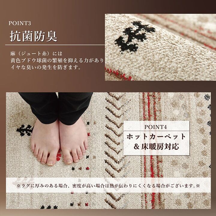 トルコ製のウィルトン織りカーペットです。本商品の『繊維の密度を表すノット数』は112,000ノットです。ギャベ柄を落ち着きのある色合いのグラデーションでまとめました。本商品のパイル部分にはポリプロピレン素材を使用しております。ポリプロピレンはヘタリにくく、耐久性に優れ、繊維の中でも軽い素材です。また、汚れが付着しにくく、遊び毛や毛玉が非常に出にくいという特徴もあります。本商品にはフリーゼセット加工を施しております。フリーゼセット加工でパイルをツイストすることによりボリューム感を出し、ふかふかとした肌感触に仕上げました。ホットカーペットカバーや床暖房にも対応しております。安心して年間お使い頂けるカーペットです。