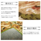絵羽柄のカーペットです。表地には撥水加工を施しておりますので、汚れにくくお手入れも簡単です。表地のパイル部分にはナイロンを使用しています。ナイロンは強度や摩耗に強く、速乾性があり、また遊び毛も出にくいなどの特徴があります。ダイニングカーペットや敷き詰めカーペットとしてのご使用にも適しています。季節を選ばず、オールシーズンご使用頂けます。同柄のキッチンマットも取扱いがありますので、トータルでのコーディネートもお勧めです。