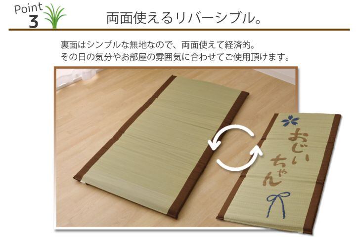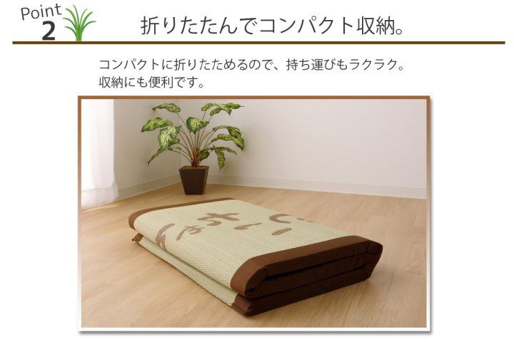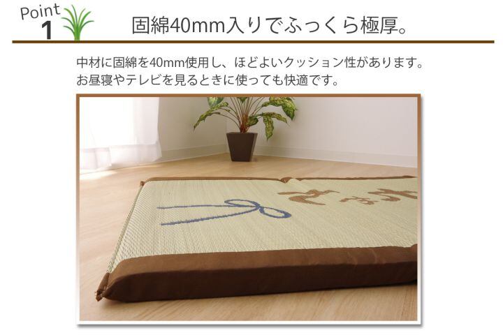 寝っころがってテレビを見たり、折りたたんで腰かけたり、リビングでのお昼寝用に、などいろいろな使い方ができるフリーマットです。お仕事のちょっとした休憩時間の仮眠にも最適です。い草には1.綿の約3倍の吸湿性があり汗のじめじめを軽減します。2.湿度の調整作用があり、蒸れにくく快適な就寝を促します。3.汗のにおいの元となる化学物質を90%以上抑え、においを軽減します。などの効果があります。中材には固わた40mmを使用していますのでフローリングでも快適にご使用頂けます。い草に青森ヒバ加工を施しています。(抗菌・防臭効果)青森県のヒバの木から抽出した「ヒバ油」を現地に送り、メーカー独自の技術で材料や商品に加工しました。「ヒバ油」には、ヒノキチオールという天然物質としては極めて抗菌性の高い成分が含まれ、医療や食品など多分野で利用研究が進められています。※自然素材であること、また職人が一つ一つ手作業にて加工を行うため、形状のバラつきや表示サイズと多少異なることがあります。ご了承下さい。