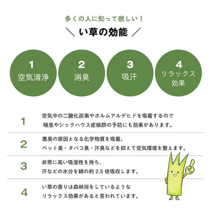 い草を使用した枕です。お昼寝や就寝時におすすめです。い草には、空気をきれいにする、湿度を整える、高い吸湿性、消臭、汚れにくい、燃えにくい、森林浴効果などの効果があります。い草の特徴により、就寝時の汗の吸収や、消臭をしてくれるので快適に過ごせます。