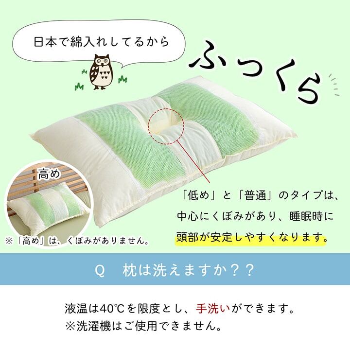 選べる高さが3種類。ご希望のサイズを選んで下さい。ヒバエッセンス練り込みパイプを使用しています。青森県のヒバの木から抽出した「ヒバエッセンス」をメーカー独自の技術でパイプに加工しました。ヒバエッセンスには、ヒノキチオールという、天然物質としては極めて抗菌性の高い成分が含まれています。(無加工品に比べ、抗菌・防臭効果があります。)ヒバエッセンスで安らかな森の眠りをご提案します。パイプ使用のため、通気性がよく、熱がこもらず心地よくご使用できます。リバーシブルタイプでひばパイプ側、ポリエステルわた側の2種類の触感を楽しめます。※中材の出し入れはできません。