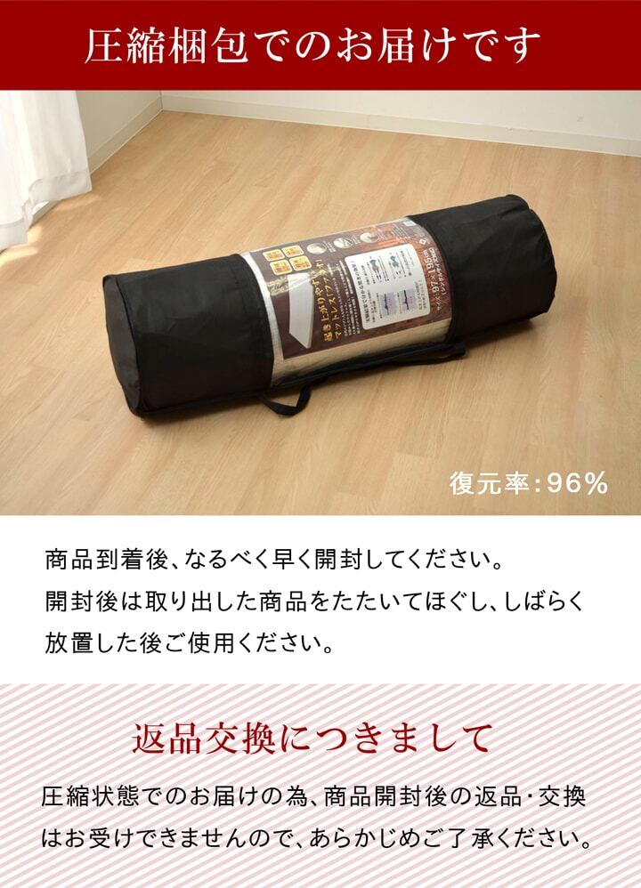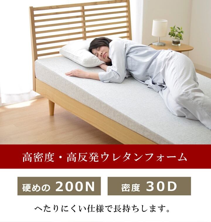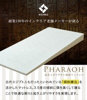 傾斜療法をとりいれたマットレスです。傾斜療法とは、2000年頃から注目されるようになった治療法です。頭を高くして寝ることで、体に良い影響があるといわれています。特徴は、【起き上がりやすい】傾斜があるため起き上がりやすく、寝ても傾斜を感じにくい3.5度の絶妙な角度になります。また、全体に傾斜があるので寝返りも無理なくうつことができます。【体圧分散】高い弾力性と押し上げる力により全身の体圧が分散されるため、腰への負担が軽減されます。【収納】収納用バンド付きで収納幅が30cmとなります。