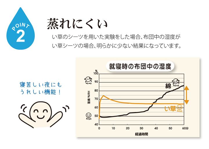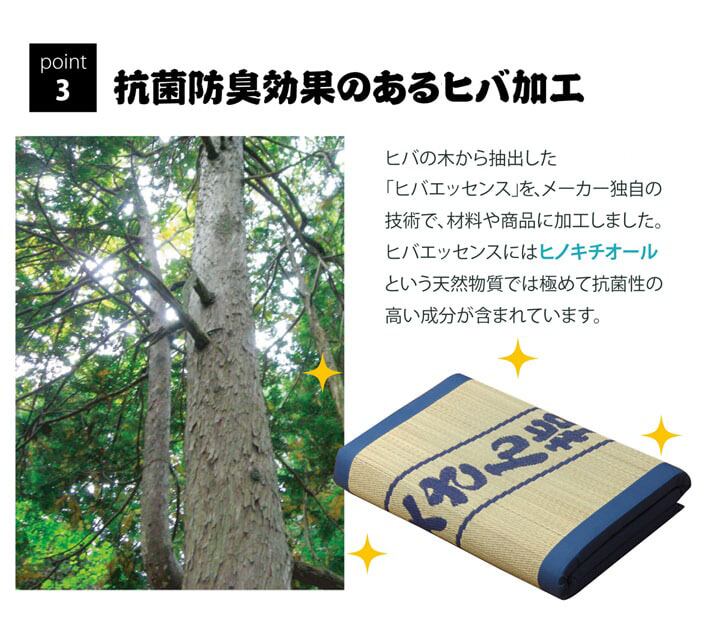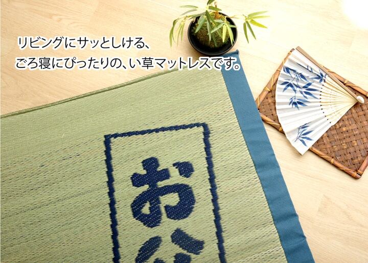 寝っころがってテレビを見たり、折りたたんで腰かけたり、リビングでのお昼寝用に、などいろいろな使い方ができるフリーマットです。い草には1.綿の約3倍の吸湿性があり汗のじめじめを軽減します。2.湿度の調整作用があり、蒸れにくく快適な就寝を促します。3.汗のにおいの元となる化学物質を90%以上抑え、においを軽減します。などの効果があります。中材には固わた40mmを使用していますのでフローリングでも快適にご使用頂けます。い草に青森ヒバ加工を施しています。(抗菌・防臭効果)