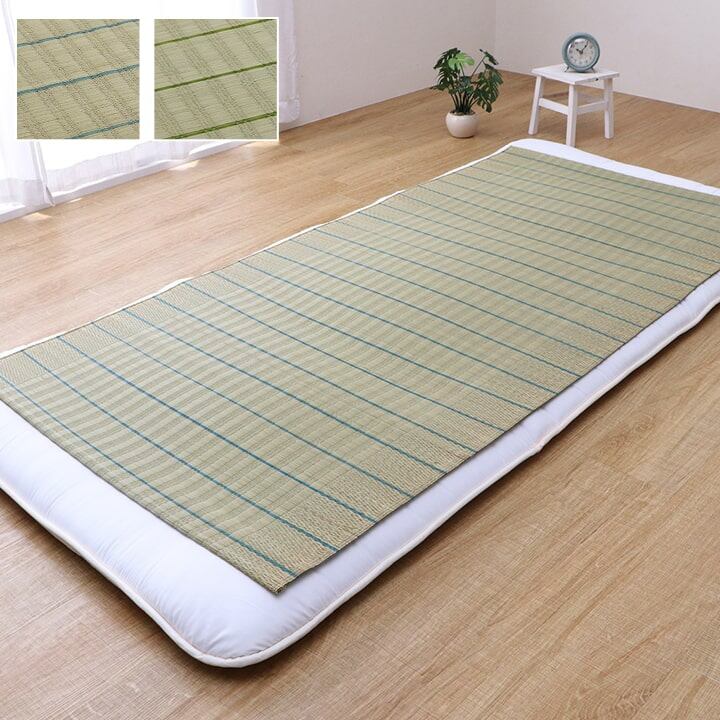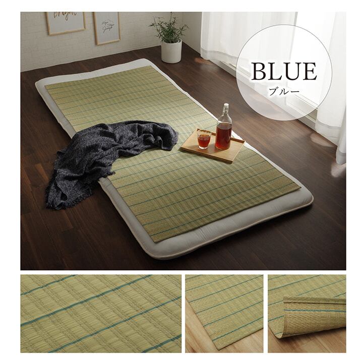 国産(九州産)のい草を使用したネゴザ(寝ござ)です。一本一本が太く、表皮が厚く繊維がキメ細かいので、弾力性があり、耐久性に優れています。い草には1.綿の約2.5倍の吸湿性があり汗のじめじめを軽減します。2.湿度の調整作用があり、蒸れにくく快適な就寝を促します。3.汗のにおいの元となる化学物質を90%以上抑え、においを軽減します。などの効果があります。また、ヒバエッセンス加工を施しています。(抗菌・防臭効果)