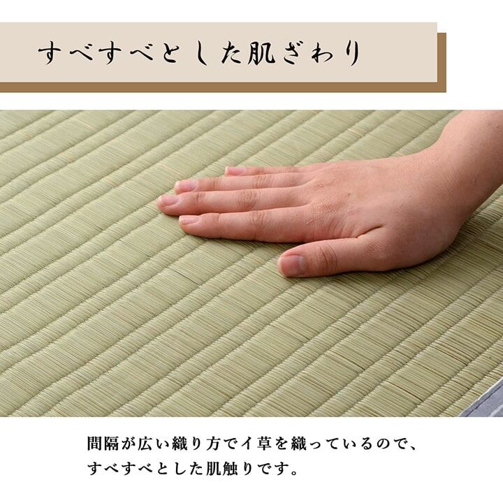 国産(熊本県八代産)のい草を使用したネゴザ(寝ござ)です。国産のイ草は一本一本が太く、表皮が厚く繊維がキメ細かいので、弾力性があり、耐久性に優れています。い草には1.綿の約3倍の吸湿性があり汗のじめじめを軽減します。2.湿度の調整作用があり、蒸れにくく快適な就寝を促します。3.汗のにおいの元となる化学物質を90%以上抑え、においを軽減します。などの効果があります。い草に青森ヒバ加工を施しています。(抗菌・防臭効果)