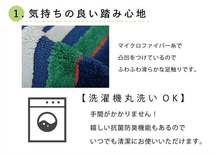 抗菌防臭の機能性を重視した商品。マイクロファイバー糸を使い、凹凸をつけているので滑らかな足触りが体感できます。
