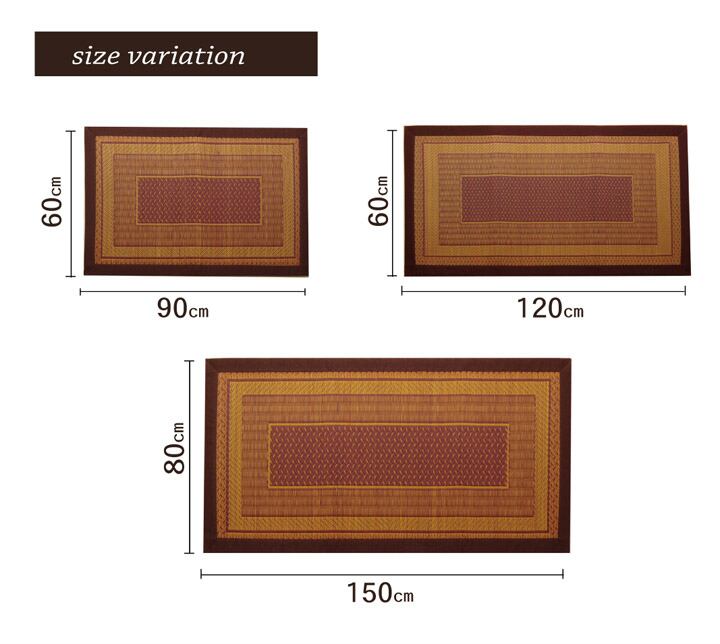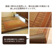 九州産のい草を使用した玄関マットです。一本一本が太く、表皮が厚く繊維がキメ細かいので弾力性があり、耐久性に優れています。また使用していくうちに綺麗な黄金色に変化していきます。い草には空気の清浄化作用、湿度の調節作用があり、汚れにくいといった特徴があります。青森ヒバ加工を施しています。(抗菌、防臭効果)裏には適度なクッション性があり、滑りにくい国産のウレタンを貼っています。