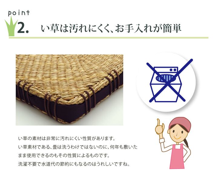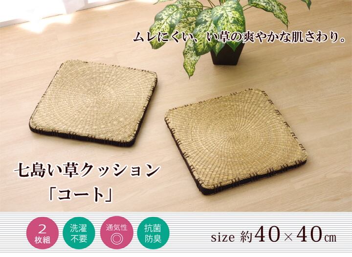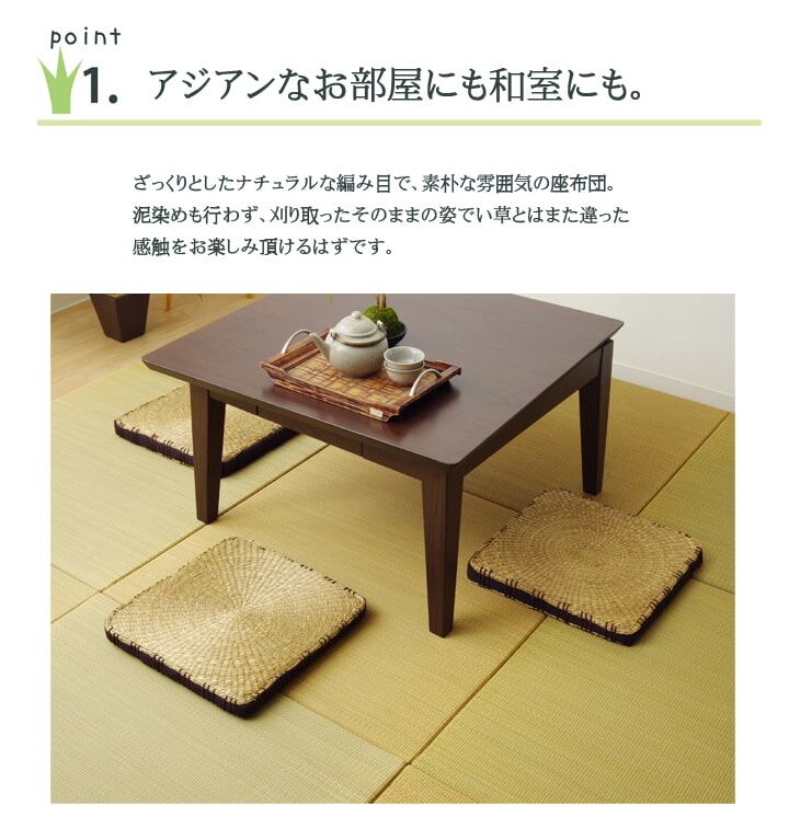 ベトナムの太陽の下で元気に育った七島イ草を使用しています。七島イ草はベトナムでとれる草の一種で、日本のイ草によく似た効能を持ち合わせています。特長として1.空気の清浄力(空気汚染の原因や人間の健康に悪影響を及ぼしているホルムアルデヒド、二酸化窒素を吸収します。)2.耐久性があります。肌触りは自然素材ならではの「ざっくり感」、座り心地は「ふんわり」です。中材にはウレタンを使用していますので不思議な快適さを感じることができます。置くだけで雰囲気の出る七島イ草は家のリビングに、お店(居酒屋、和風の飲食店など)に、簡単にイメージ通りの空間にするお手伝いをしてくれます。一つ一つ丁寧に編み込んでいますので、しっかりしていて丈夫です。※自然素材であること、また職人が一つ一つ手作業にて加工を行うため、形状のバラつきや表示サイズと多少異なることがあります。ご了承下さい。