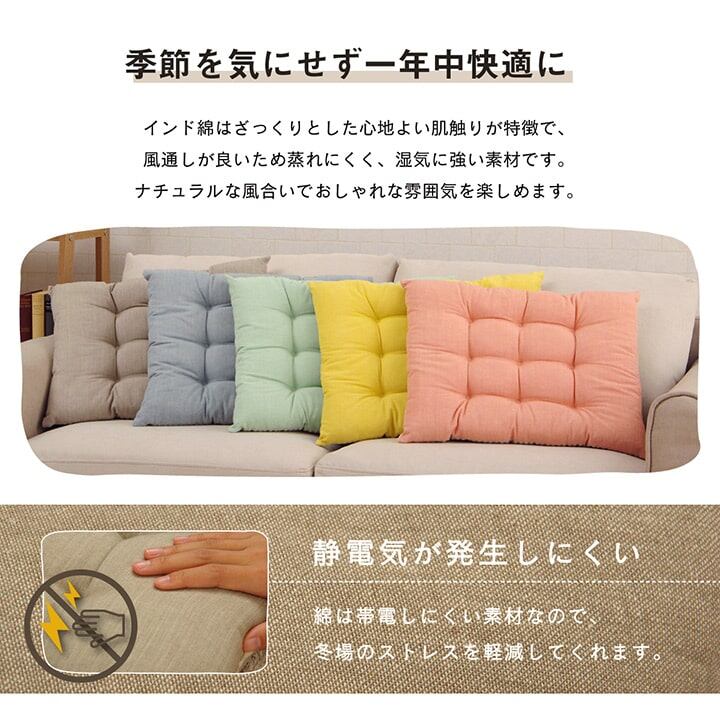 安心の日本製です。インド綿100%のオーガニックコットンを使用し、ざっくりとした肌触りが特徴です。シンプルで飽きの来ないデザインです。リビングクッションや座布団としてお使いいただけます。季節を問わずご使用いただけます。