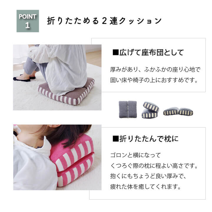 広げれば座布団や腰当てとして、折りたためばゴロンと横になってくつろぐ時の枕に早変わり。シンプルなデザインなので、お部屋のテイストを問いません。リビングでのくつろぎ時、ラグだけでは底つき感があるときに、また来客時にも便利です。長時間座るオフィス用のチェアクッションとしてもおすすめです。もちもちな感触でお尻や腰への負担をやわらげてくれます。表地は、なめらかな肌触りで季節を問わずオールシーズンご使用頂けます。独特のもちもちした柔らかなタッチ感に仕上げました。