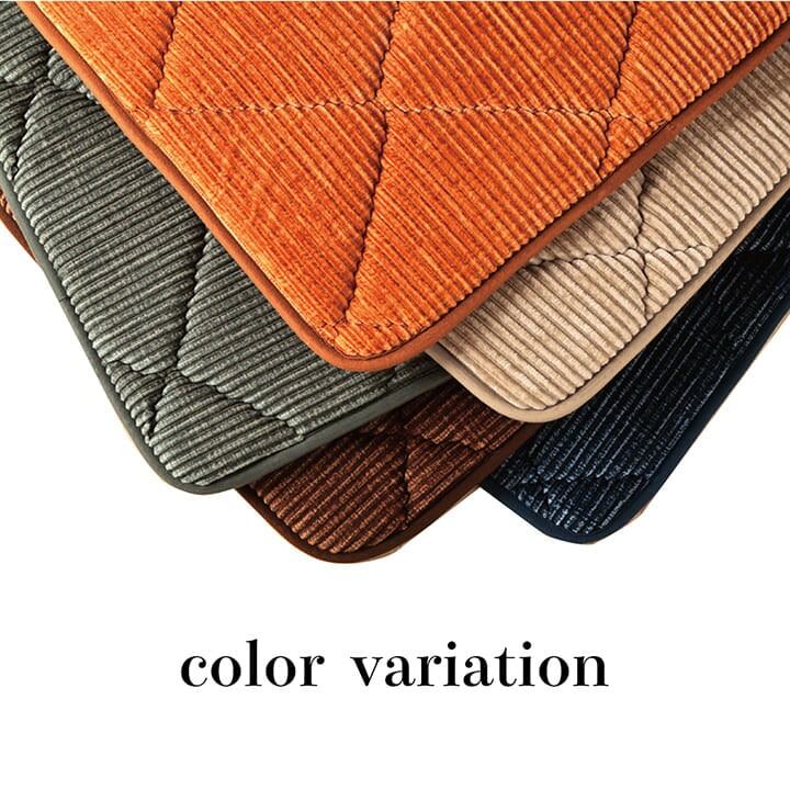 へたりにくいクッション性、弾力性があるクッションです。あたたかみのあるコーデュロイ調生地を使用しています。手触りもやわらかいです。椅子の上、フローリングの上、ソファーの上などに使用可能です。安心の滑り止め付きです。