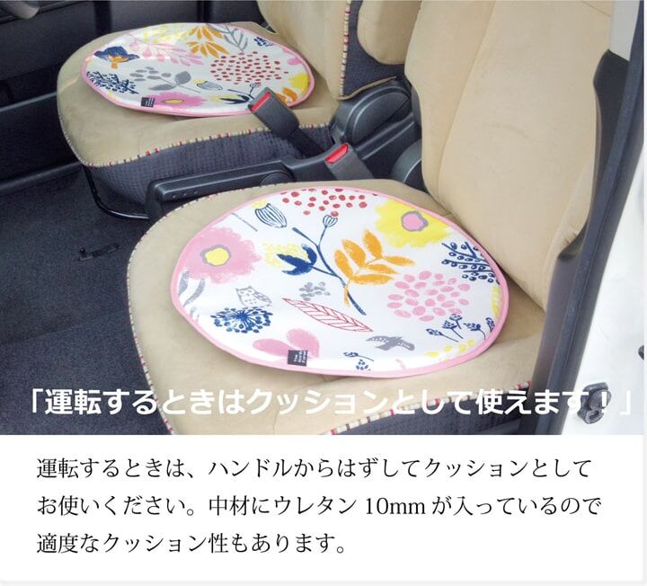 北欧テイストを取り入れた車のハンドルカバーです。北欧の森をテーマに花やリーフ、森の動物たちを素朴で味のあるスタンプタッチで表現しました。明るいカラーとデザインで車内を明るく楽しく演出します。幅広い年齢の方にお使い頂ける商品です。サラッとした肌触りなので年間を通してご使用頂けます。日よけ、汚れ防止のハンドルカバーですが、運転中は座席の上に置いてクッションとしてもご使用頂けます。また、チェアパッドとしてもご使用頂けます。中材にはウレタン10mmを使用しておりますので適度なクッション性があります。