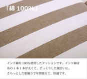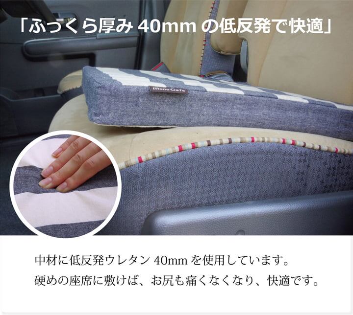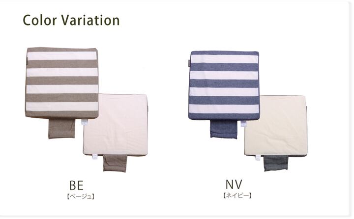 シンプルなボーダー柄をネイビーとベージュのベーシックな色で仕上げたカークッションです。シンプル・ベーシックをコンセプトにデザインしました。性別を問わず、また幅広い年齢の方にお使い頂ける商品です。生地は高品質なインド綿を使用しています。太番手の糸でざっくりと織り上げ柔らかな風合いです。サラッとした肌触りなので年間を通してご使用頂けます。中材には包み込むような柔らかさの低反発ウレタン40mmを使用しております。柔らかくお尻にフィットします。ご自宅で通常のクッションとしてもご使用頂けます。