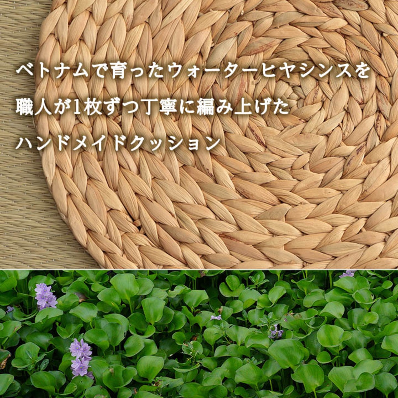 ■ベトナムで育ったウォーターヒヤシンスを職人が1枚1枚丁寧に編み上げたハンドメイドクッションです。